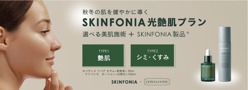 そ の S K I N F O N I A が レ テ ィ シ ア ク リ ニ ッ ク と コ ラ ボ レ ー シ ョ ン し 、 秋 冬 の 肌 を す こ や か に 導 く 「 光 艶 肌 プ ラ ン 」 + に 加 え 、 自 宅 で 施 術 後 の ア フ タ ー ケ ア が で き る S K I N F O N I A 製 品 を セ ッ ト に し た 特 別 プ ラ ン を 提 案 し ま す 。